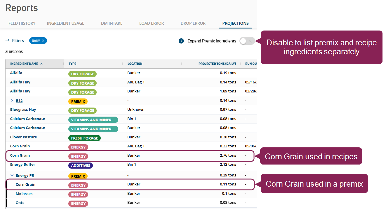 • In the Projections Report, use the new Expand Premix Ingredients toggle to control how premix ingredients are shown in projections to prevent double counting.